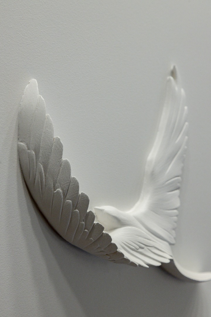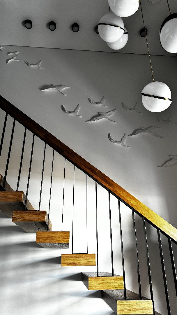 I knew what the result would be, I measured it precisely when creating the sketches, but when I found myself in the space at the final photo shoot, I felt all the power, beauty and depth of the panel in the design project. These emotions served as an incentive to write a post. The final result always remains a pleasant mystery, but everything falls into place when you see the relief in the interior. The well leading to the second level evokes a special feeling of delight in me. The architect managed to create an ascending dynamic due to the perspective reductions in the volumes of the depicted birds. I am glad that the well was decorated with exactly this decorative element. Other options arose during the discussion stage, but the birds fit in so logically and organically that now there is no doubt about the correctness of our decision. The project proved the importance of every detail in creating a unique space. As an artist, I have the opportunity to immerse myself in architectural harmony and find something new not only in creativity, but also inside myself. I value her very much and expect similar discoveries from upcoming projects.
