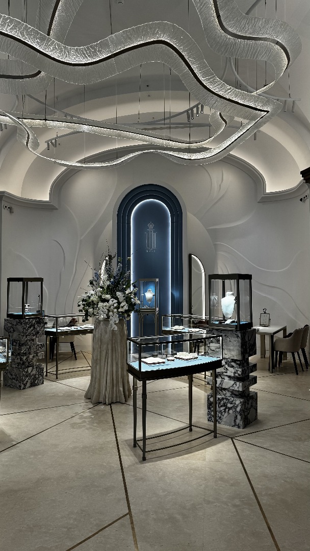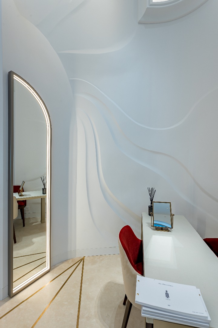 Here I would like to express my admiration for the competent placement of accents by the architect-designer, the interior sounds harmoniously with all the decorative elements: a chandelier, a panel, a portal and, of course, diamonds. Making the relief a background became a strategically important decision not only because of the space, so the history of the brand and its products came forward. Posié is a socio-cultural project of Alrosa. It is aimed at studying the Russian jewelry heritage, reviving the best traditions of the Russian lapidary and jewelry school. The name Posié is consonant with the surname of Jeremiah Posier, the court jeweler of Anna Ioannovna, Elizabeth Petrovna and Catherine the Great, during whose reign Russian jewelry traditions were largely formed. The relief nobly highlights the brand's meanings, without conflicting and without taking all the attention on itself. As you can see, the panel can play different roles, it fits perfectly as a background in some projects and serves as a pronounced dominant in others. It all depends on the goals of your design project and the key idea. When I enter into cooperation with architectural designers, I study the drawings in detail, literally synchronize with the space and its designer. Creating an art tango between the artist and the customer, in which it is important to move in unison.