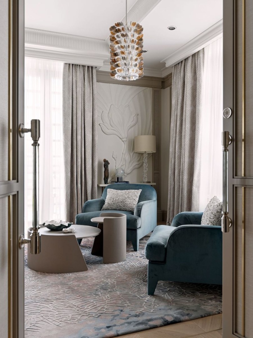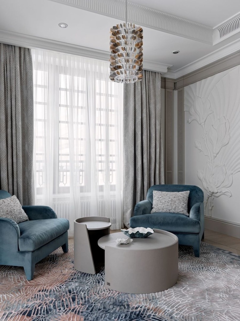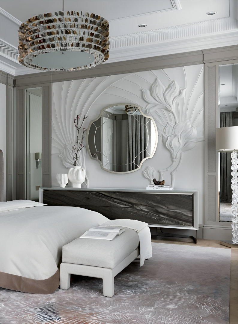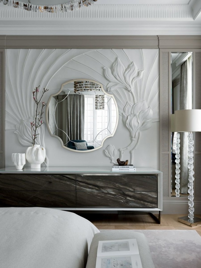 The rays in the bedroom were inspired by one of our works with Anna Muravina. We borrowed certain elements and brought a new image to them. The project turned out to be unique, with two such different, but at the same time delicate bas-reliefs.