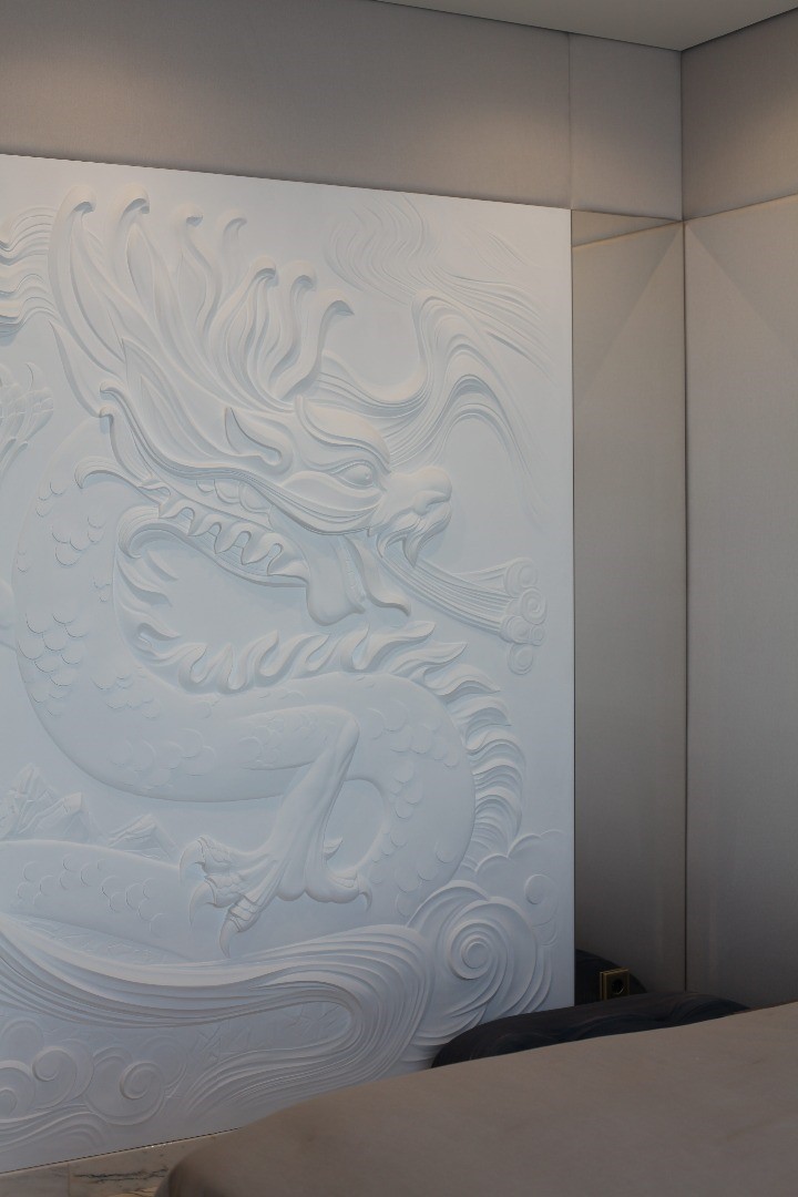 Customers often share their guests' reactions to our art and always note the unity of the studio's decor. The seemingly different bas-reliefs create a narrative that tells the story of the space. Each "viewer" will find their own fairy tale in the decor. For example, I harmoniously wove the "Snake" panel into the story of the Matterhorn mountain. The projects are located in the same interior and together create a connection: the dragon sits behind the mighty mountain. Narratives are a value that I will never give up. With the help of our studio's works, the direction of the space is built. This way, the viewer feels the community of the art and immerses himself in the world of art. Together with the team, I have always strived to create not just beautiful objects, but also a real fairy tale with relevant meanings.